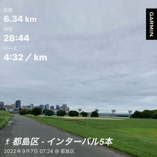 2週に1回のインターバル。 雨上がりの朝、気温は23度。9月になり、朝晩はかなり涼しくなってきたので走りやすい。今回から設定ペースが上がり、キロ3:44レスト120秒。 ここ1週間、忙しいので疲労があまり抜けていない中での挑戦。 1本目、向かい風の中、腕振…