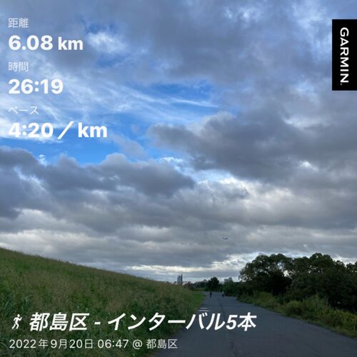 台風が過ぎ去り、さらに新しい設定のインターバル。ペースはそのままのキロ3:44で、レストが120秒から90秒に変更。 台風が過ぎたとはいえ、まあまあ風はある。しかし、ここ最近、体幹強化や向い風に対しての走り方を意識しているので、何とかやりきりたい。 …