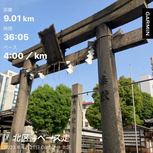 仕事の鬱憤を晴らすため速めのペース走。出来ればキロ4で8キロ以上は走りたい。 コースは最近発見した、氏神様の周りを走る一周約1.1キロの周回コース。 ただ、このコースの難点は左岸線工事の為に4ヶ所に警備員がおり、何回も前を通らないといけない事。 4…