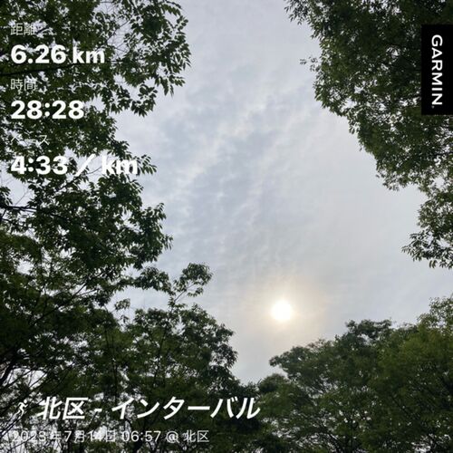 今日はインターバルにうってつけな曇り空。しかし26度で、雨上がりなので湿度も高い。ただ、日差しがない分涼しく感じる。 今日の設定もキロ3分45秒でレストは2分。 お盆明けくらいまでは夏仕様の設定でいこうと思います。いっぱいいっぱいにならないように…