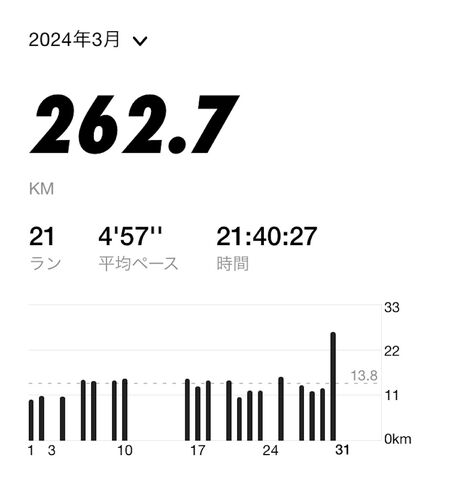 今日で3月も終わり。 色々と冴えない事も多かったけど、いつも通り一瞬で過ぎていく。 下がりに下がったモチベーションも何とか回復してマエムキに。 今月の月間走行距離は262.7キロ。 謎の調整ランも無事終わり、ポイント練も出来るようになりました。 ただ…