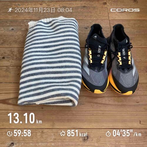 11月中旬とは思えない気候。 Tシャツが見当たらずロンTを着たけど暑過ぎた。まだまだ半袖でもいけそう。 それにしても風もなく穏やかな天気、日曜は今日みたいな感じなら良いのにな。 今日は40分ジョグ、ラスト1キロ区間に200mの流しを3本。 シューズはアデ…