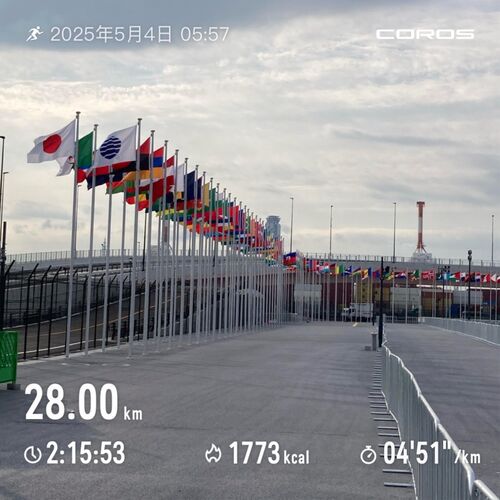 開幕したし西ゲートにも走って行けるようになったのか確認するため、今朝は万博ラン。 結果、変わらず行けませんでした…。 今回で3回目の万博ラン、万博手前にある全長約1キロの夢舞大橋を上りは全力でと思っていたけど途中でしんどくて失速。キロ5までは落…