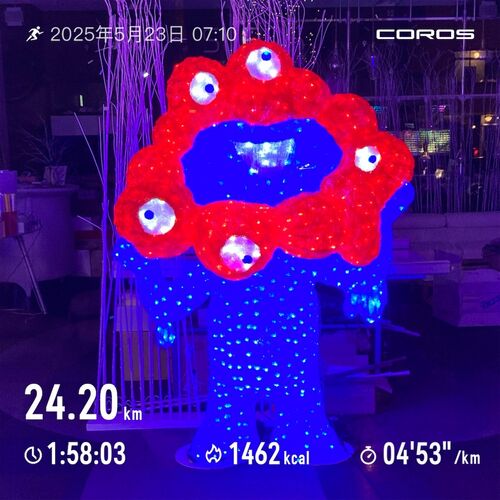 夜の街で見かけたミャクミャク。イルミネーションなのでニュアンスが少し違い、微妙にこわい。 万博のパークアンドライドが明日から半額になるみたい。家から電車だと往復860円やし、駅は混むしで、次回は車やな。 それはさておき、今朝は400mのインターバル…